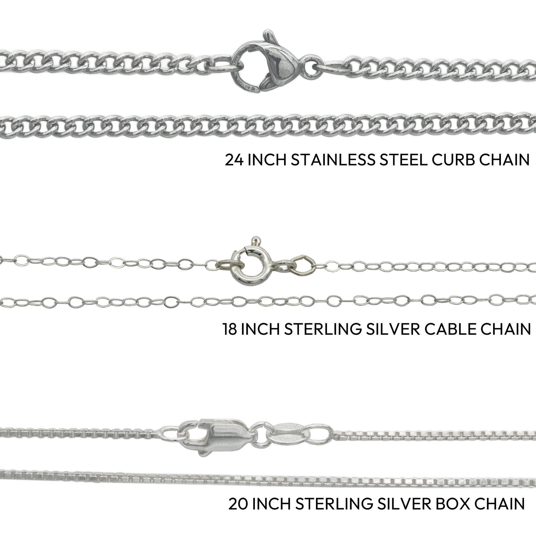 Chain Options: 24" long stainless steel curb chain, 18" sterling silver cable chain (additional $11.00), or 20" 1.2 mm sterling silver box chain (additional $25.00). Additional chains are available on our accessories page.