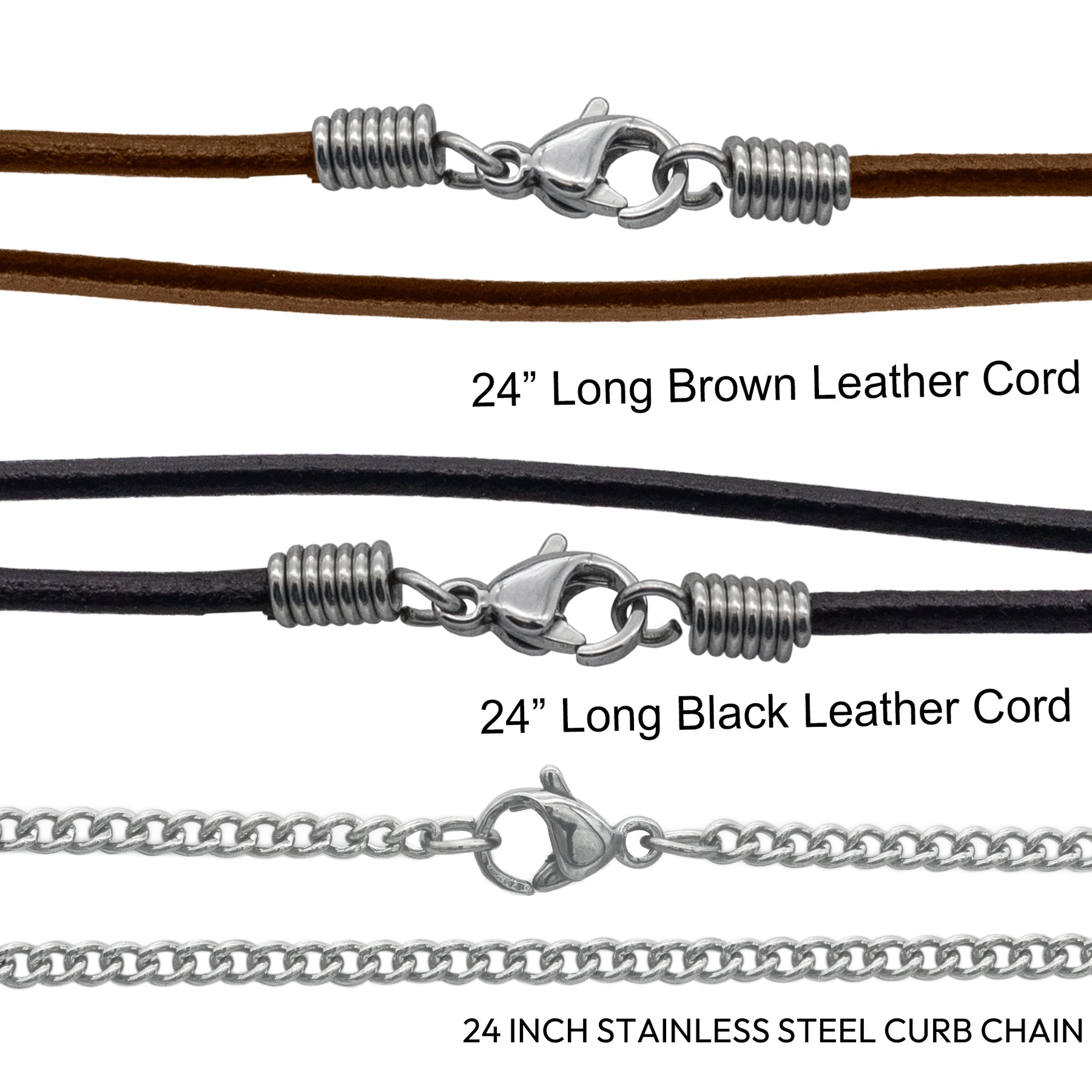 Chain Options: 24" long stainless steel curb chain, 24" black leather cord (additional $5.00), or 24" brown leather cord (additional $5.00).