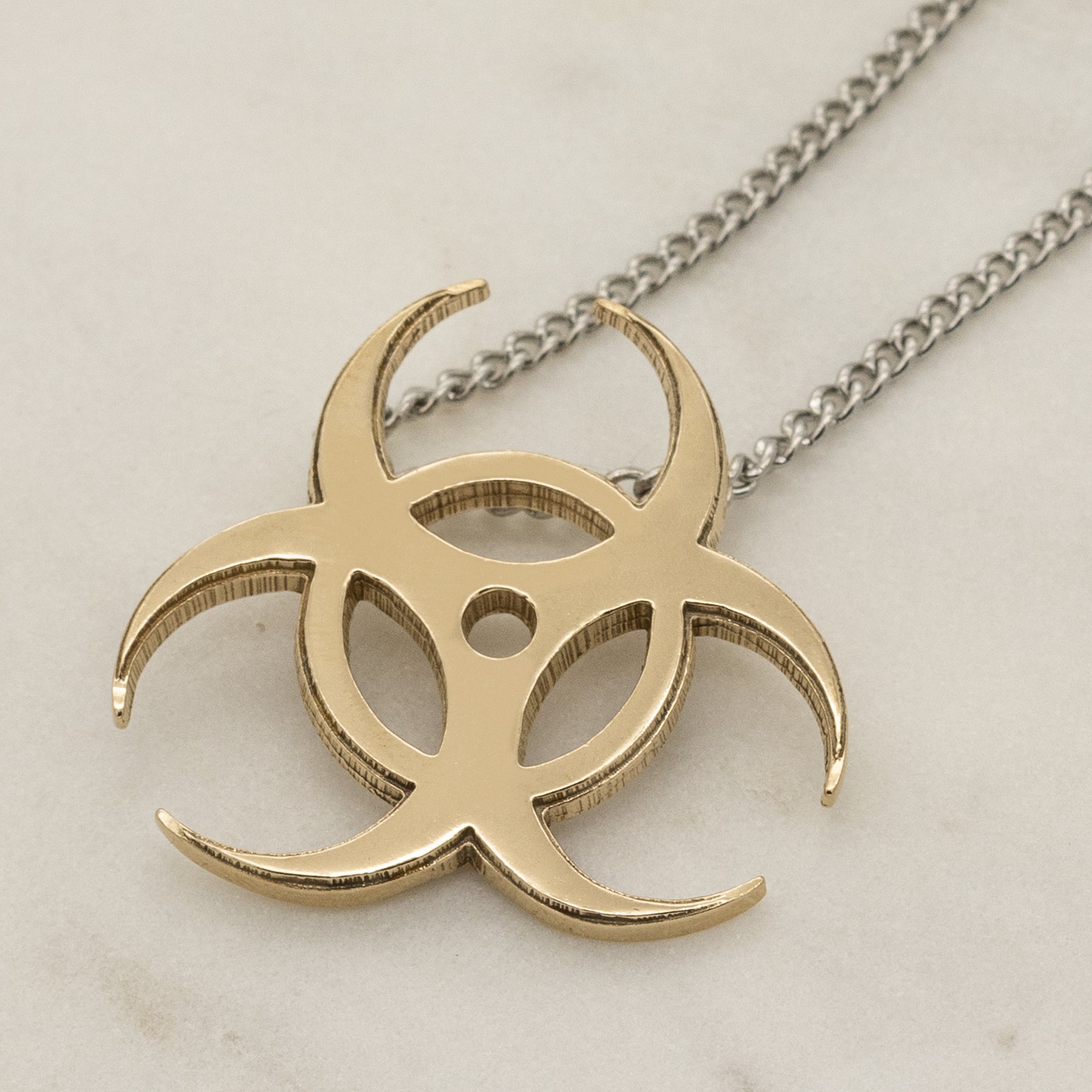 Details: The biohazard pendant is yellow bronze and measures 29.8 mm long, 32.1 mm wide and 2.1 mm wide. The biohazard necklace weighs 6.3 grams.