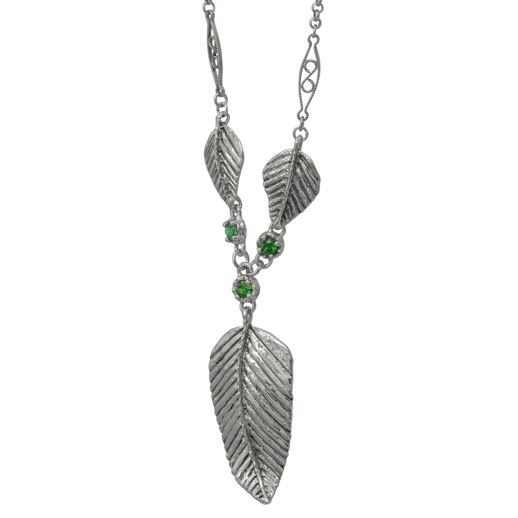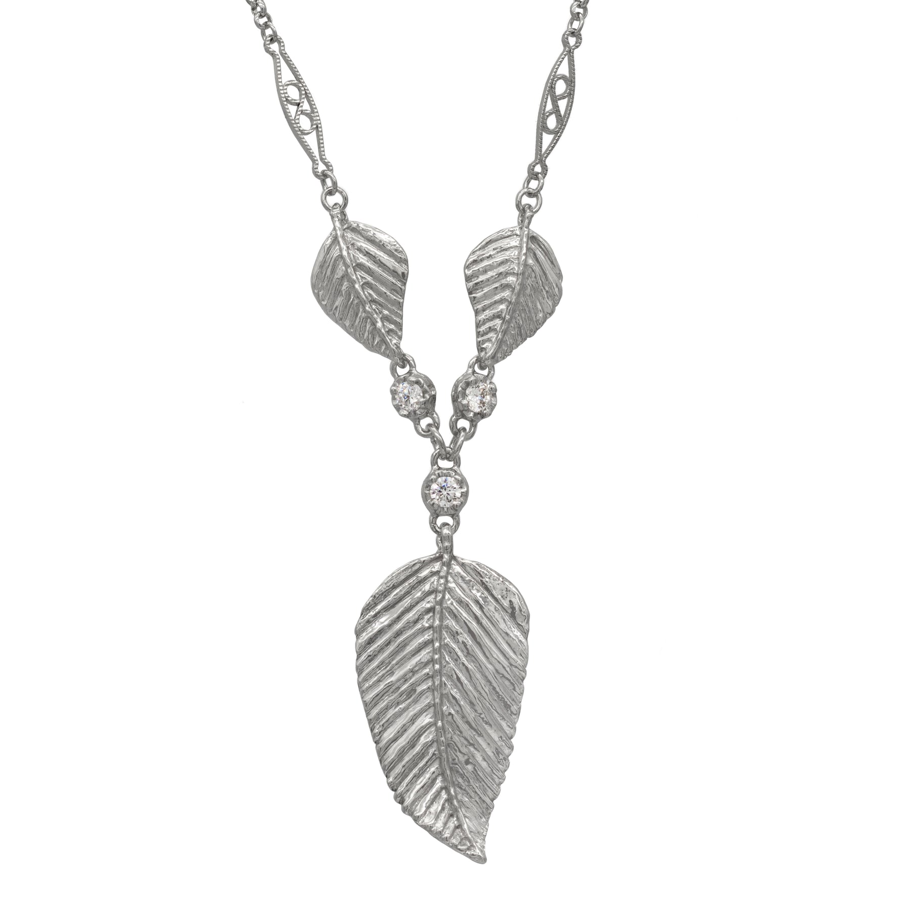 Dimensions and Details: 34.7 mm long, 17.6 mm wide, and 1 mm thick for the largest leaf to 17.2 mm long, 10.2 mm wide, and .9 mm thick for the smallest leaves. The chain is made of sterling silver filigree marquis and cable style links and measures 20" long. The necklace closes with a spring ring style clasp and largest leaf dangles from the center of the necklace.