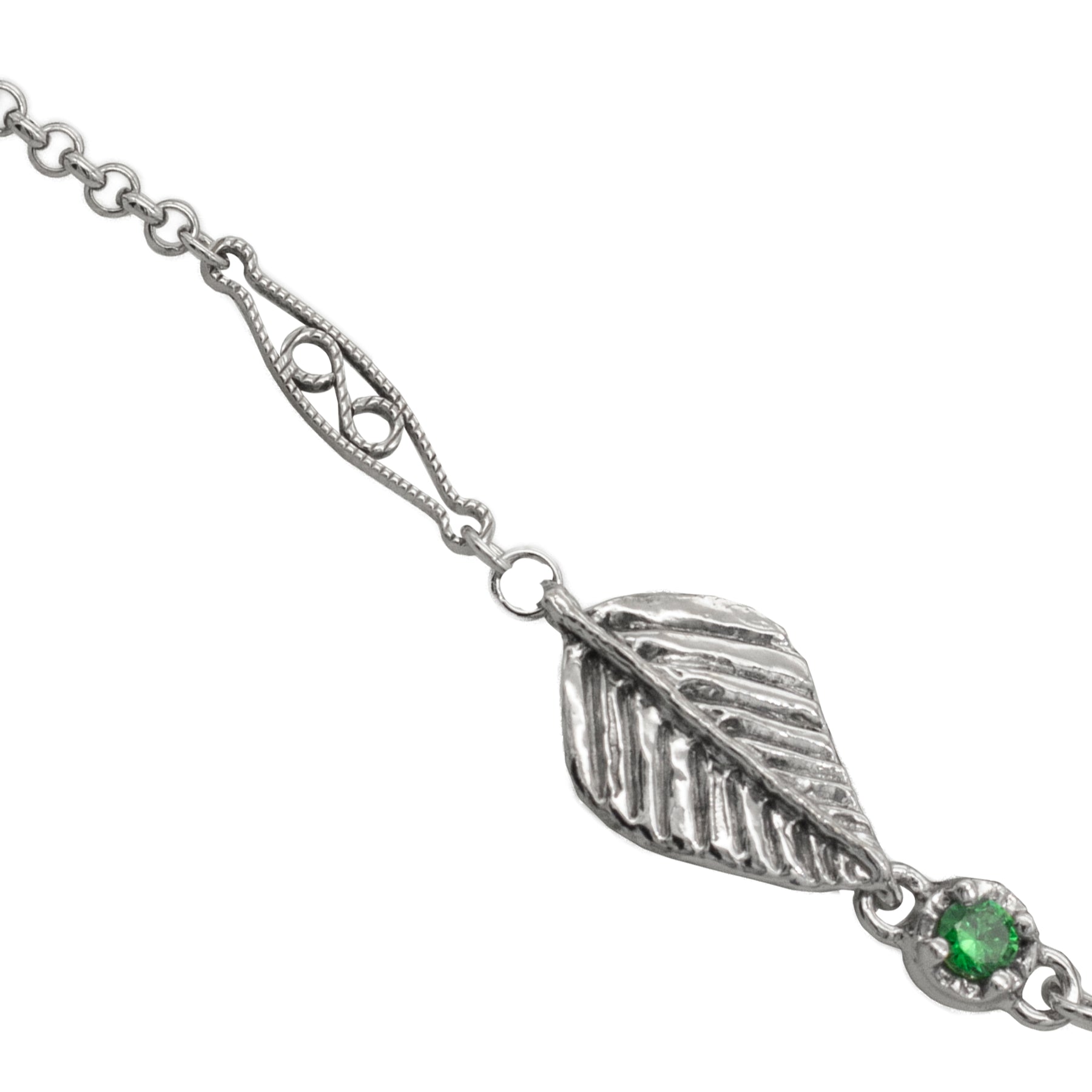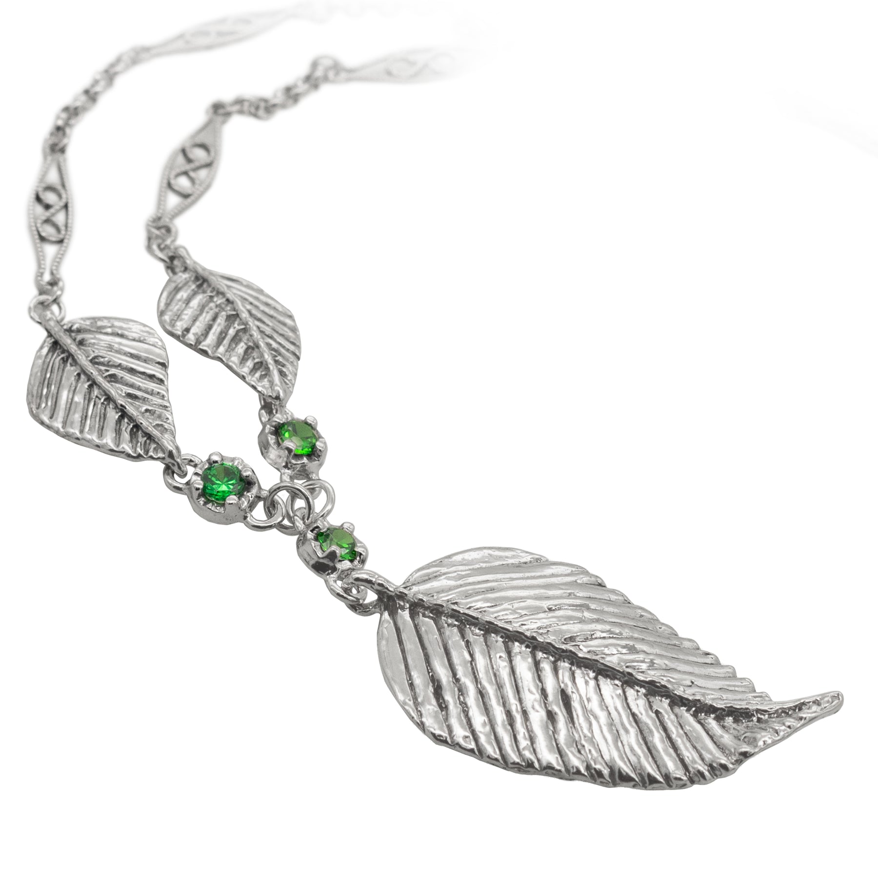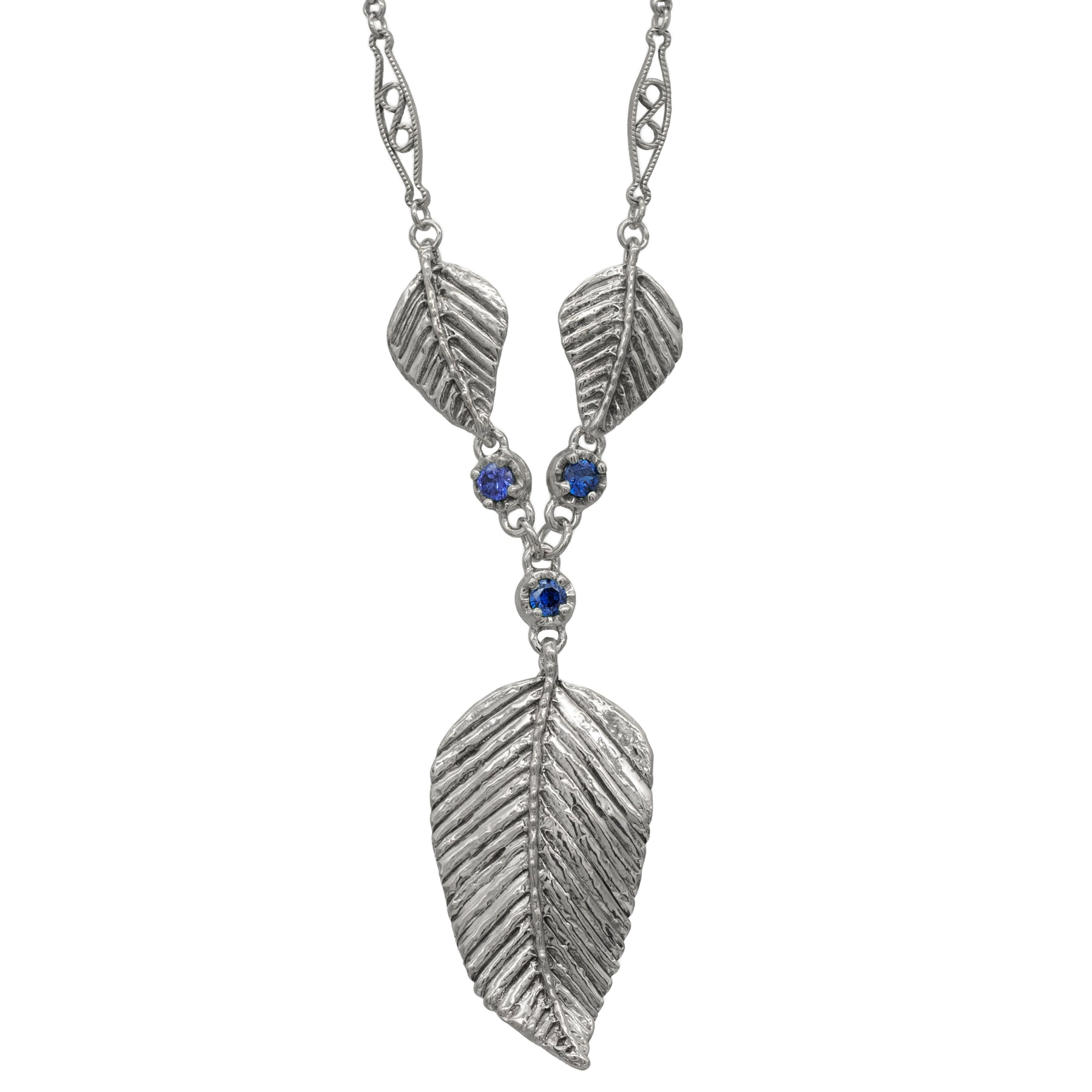 The Elven Realms Necklace is set with three Elven stones between three leaves from the forests of Lothlorien. The stones honor the Elven strongholds of Middle- earth: Rivendell (lab grown sapphire), Mirkwood (green cubic zirconia), and Lothlórien (white cubic zirconia).