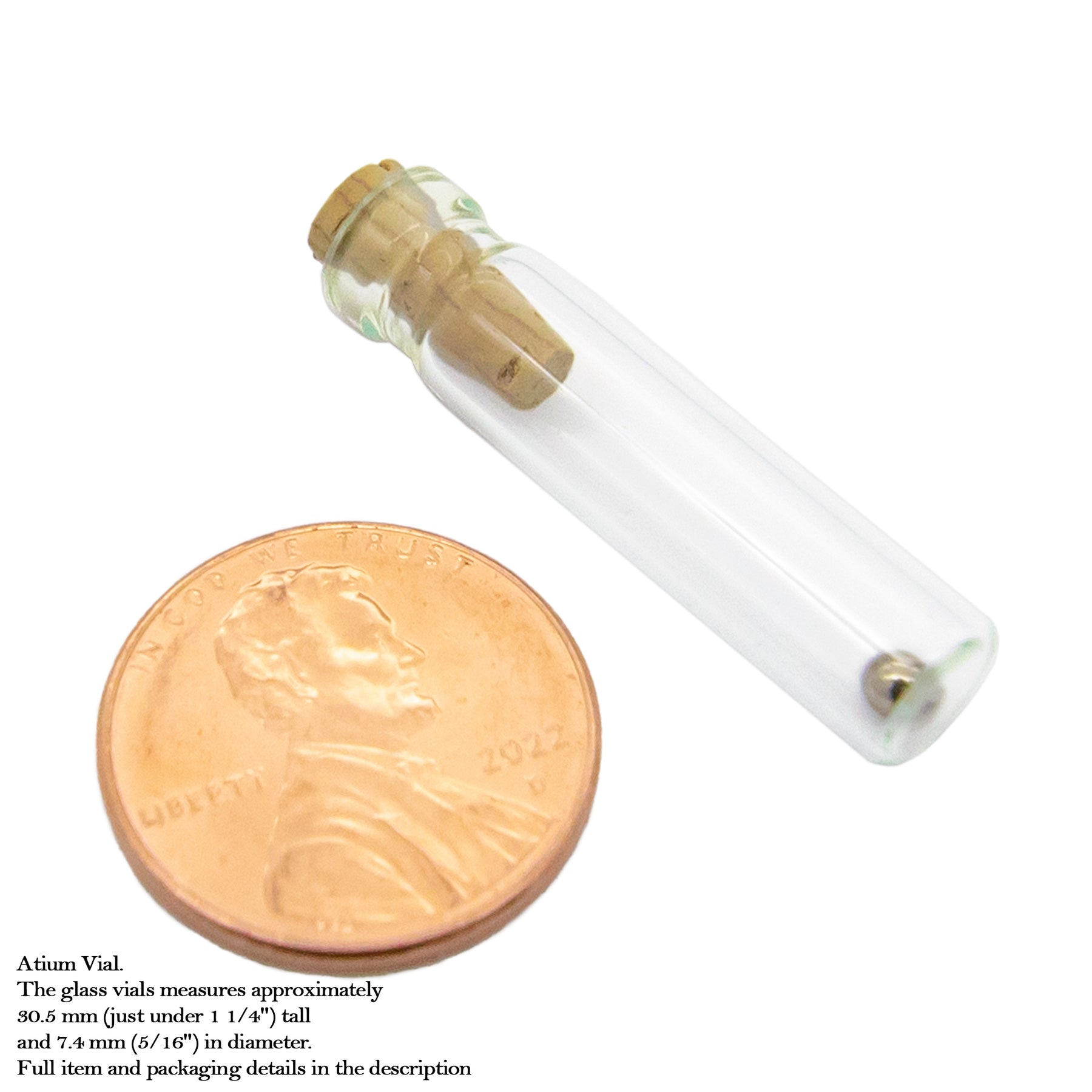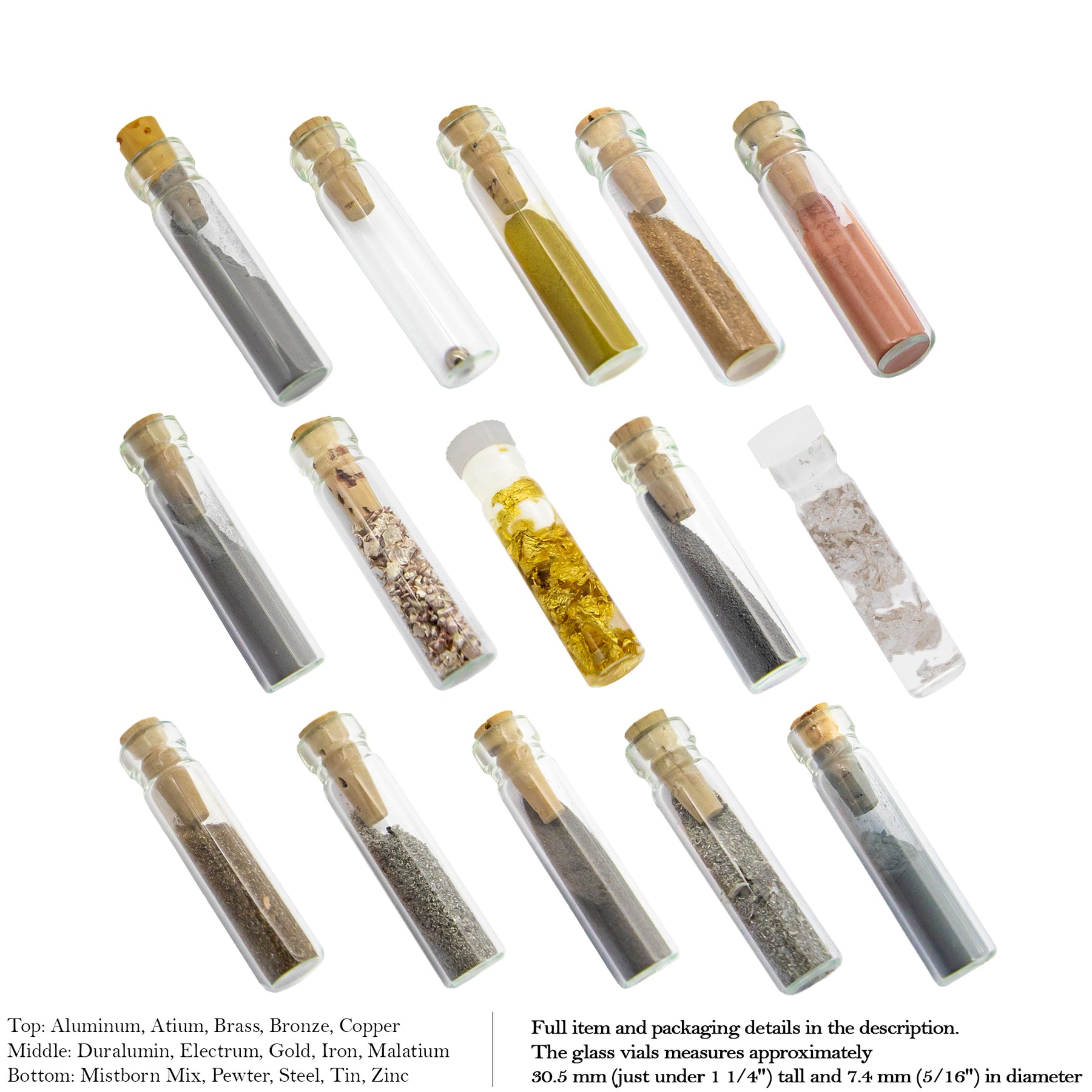 Details: The glass vials contain actual metals and is stopped with a cork. We don't suggest removing the cork. The metals vials are interchangeable with the Mistborn Vial Necklace. The vial measures 30.5 mm tall and 7.4 mm in diameter.