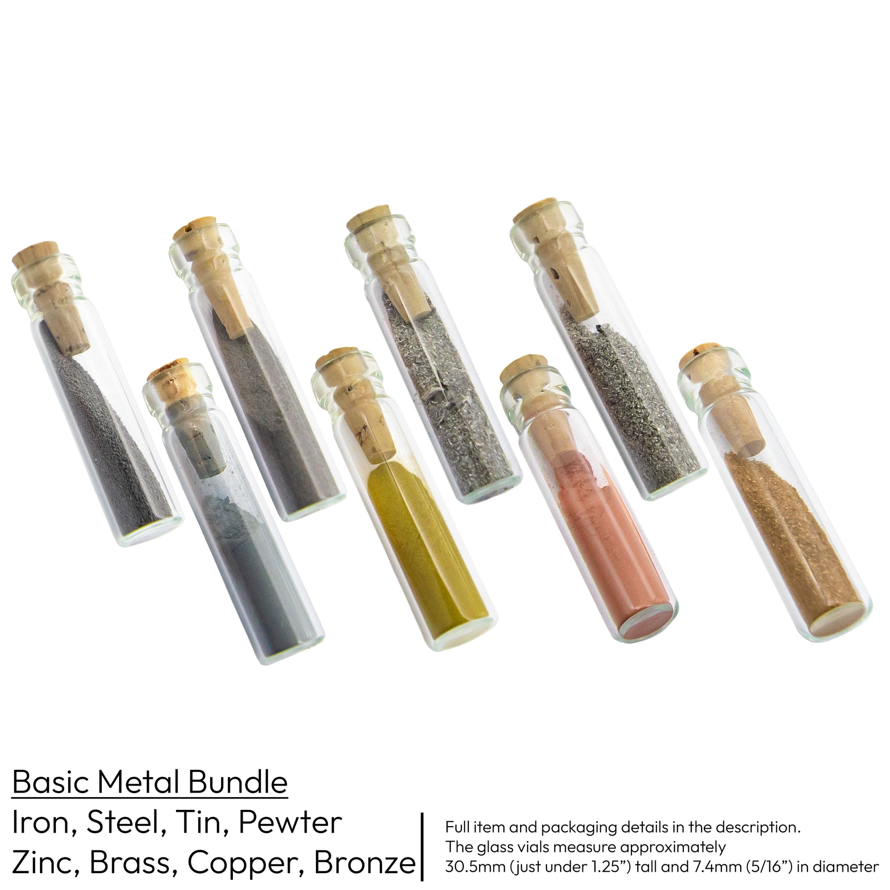 Eight Vial Set - Basic Metals: Iron, Steel, Tin, Pewter, Zinc, Brass, Copper, and Bronze