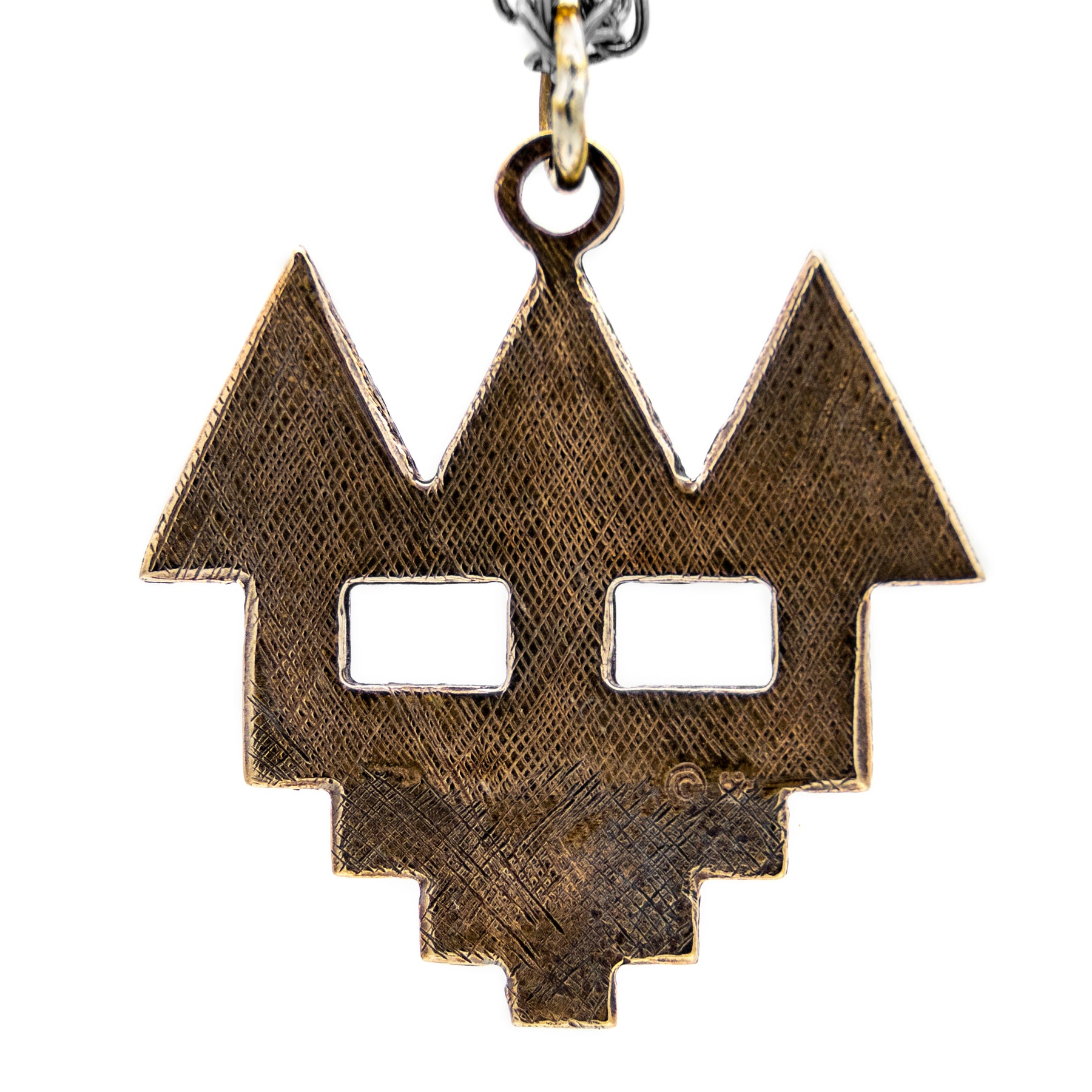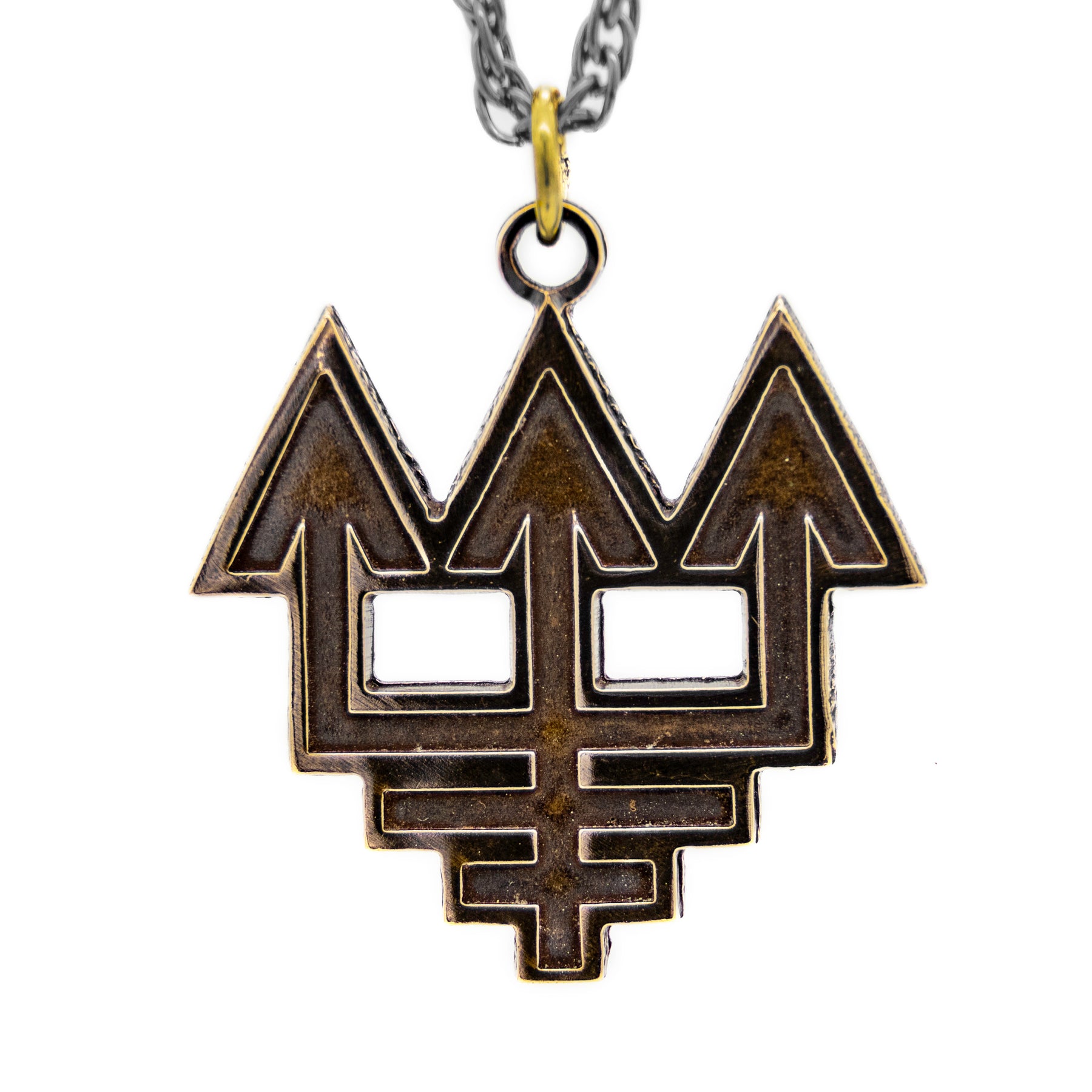Details: The Blue symbol pendant is antiqued yellow bronze and measures 36.9 mm tall including bail, 34.9 mm wide, and 2.8 mm thick. The pendant weighs 12.4 grams. The back of the pendant is textured and stamped with our makers mark and copyright.