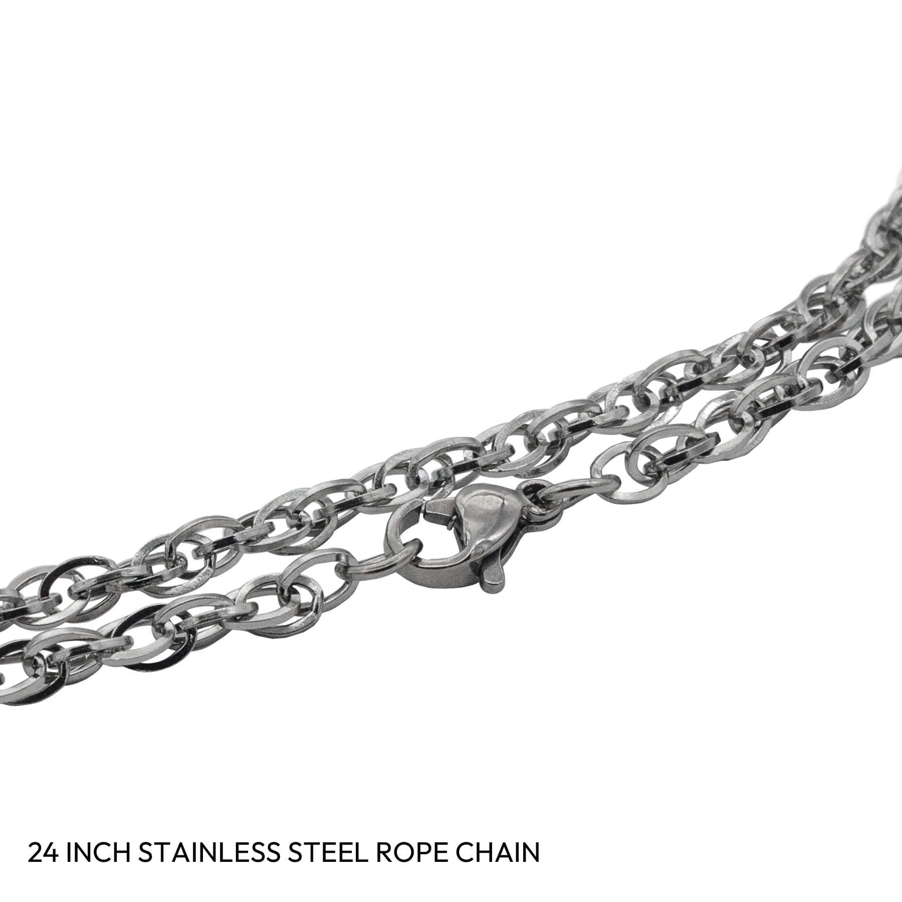 Chain Options For necklace version: 24” Stainless Steel Rope Chain. Additional chains are available on our accessories page. (Due to the weight of Elessar, we do not recommend smaller chains, such as the 20” sterling silver box chain or the 18” Sterling Silver Cable Chain)
