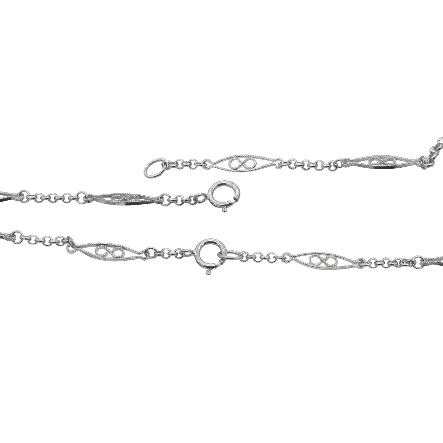 Dimensions and Details: 34.7 mm long, 17.6 mm wide, and 1 mm thick for the largest leaf to 17.2 mm long, 10.2 mm wide, and .9 mm thick for the smallest leaves. The chain is made of sterling silver filigree marquis and cable style links and measures 20" long. The necklace closes with a spring ring style clasp and largest leaf dangles from the center of the necklace.