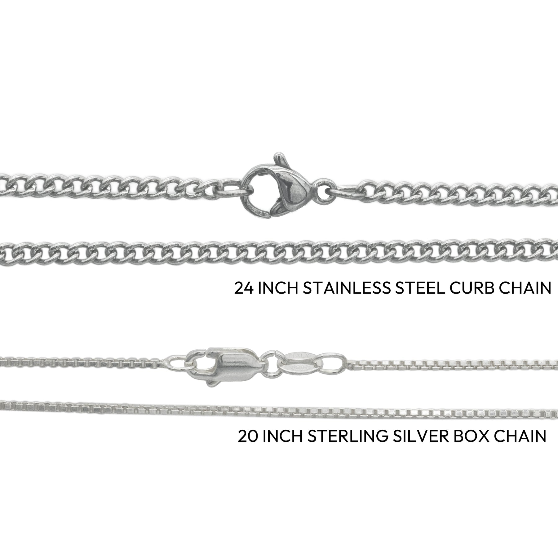 Chain Options: 24" stainless steel curb chain or 20" long sterling silver 1.2 mm box chain ($25.00 USD). Additional chains are available on our accessories page.